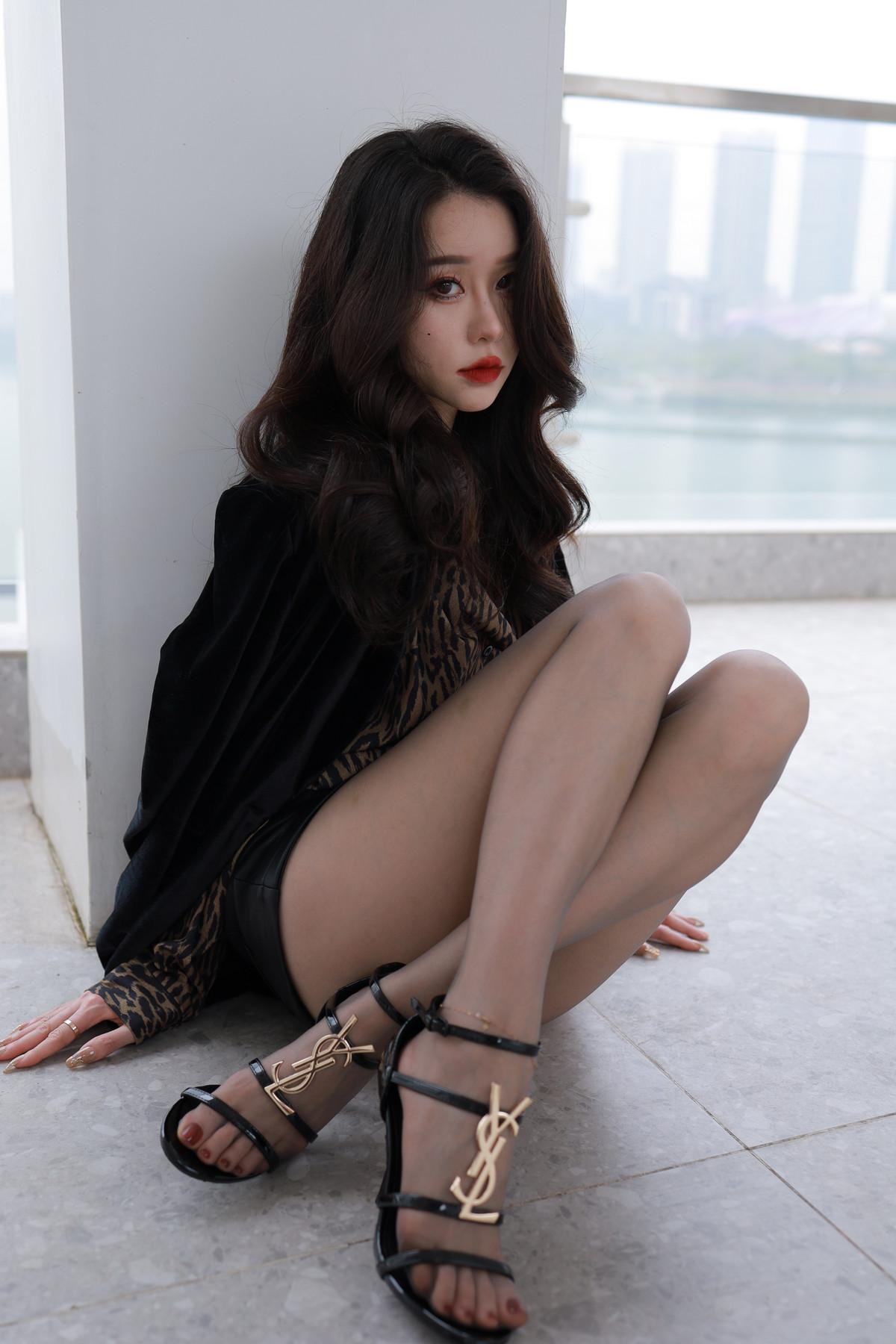 网络美女Sia不吃鱼狂野风主题性感豹纹衬衫配黑短裙露超薄黑丝秀美腿玉足迷人写真