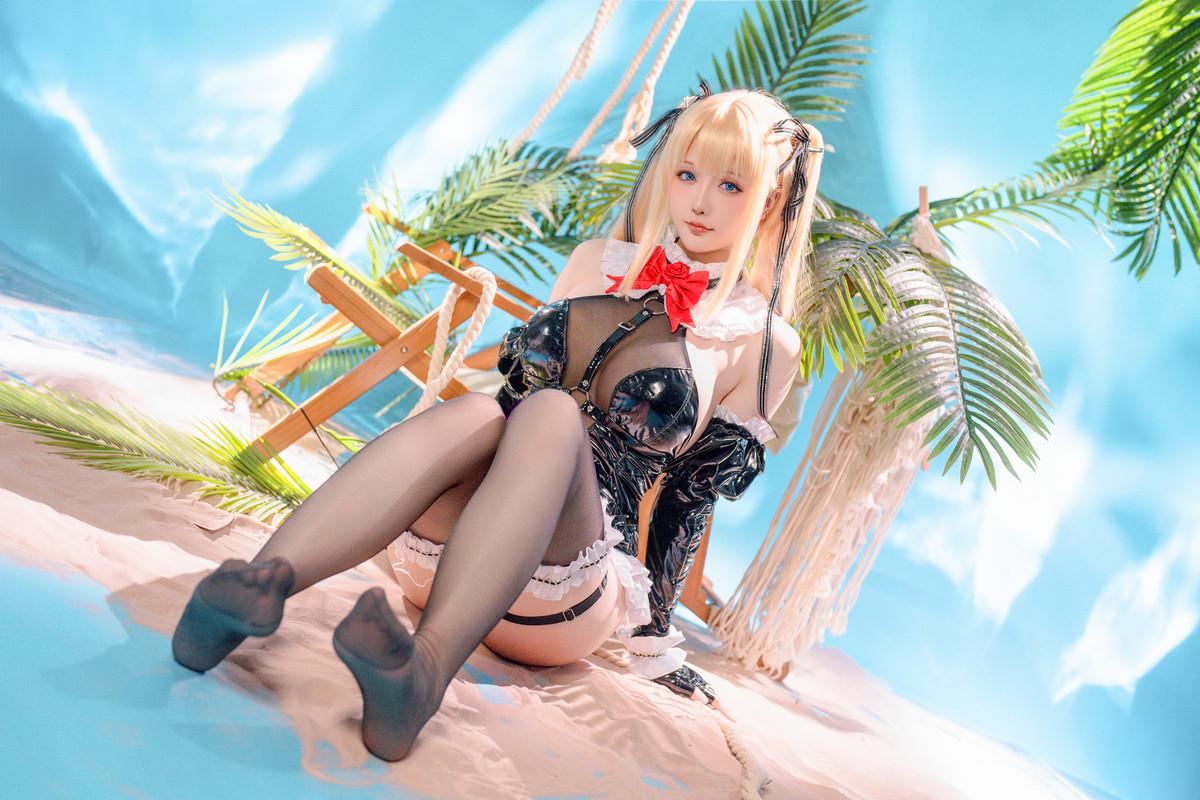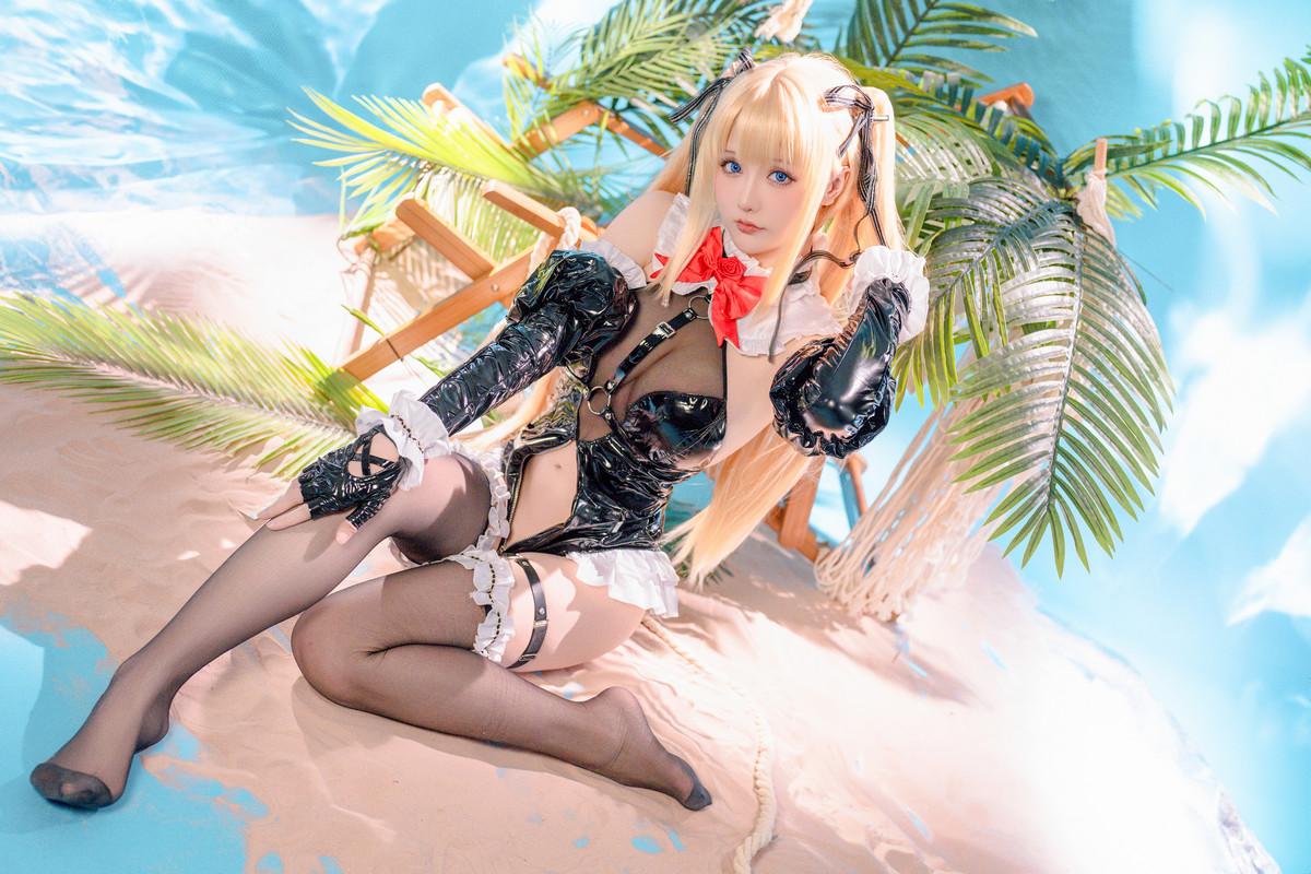 Coser小姐姐星之迟迟玛丽萝丝皮衣泳装主题性感黑色皮质高叉连体衣配黑丝袜秀美腿诱惑...