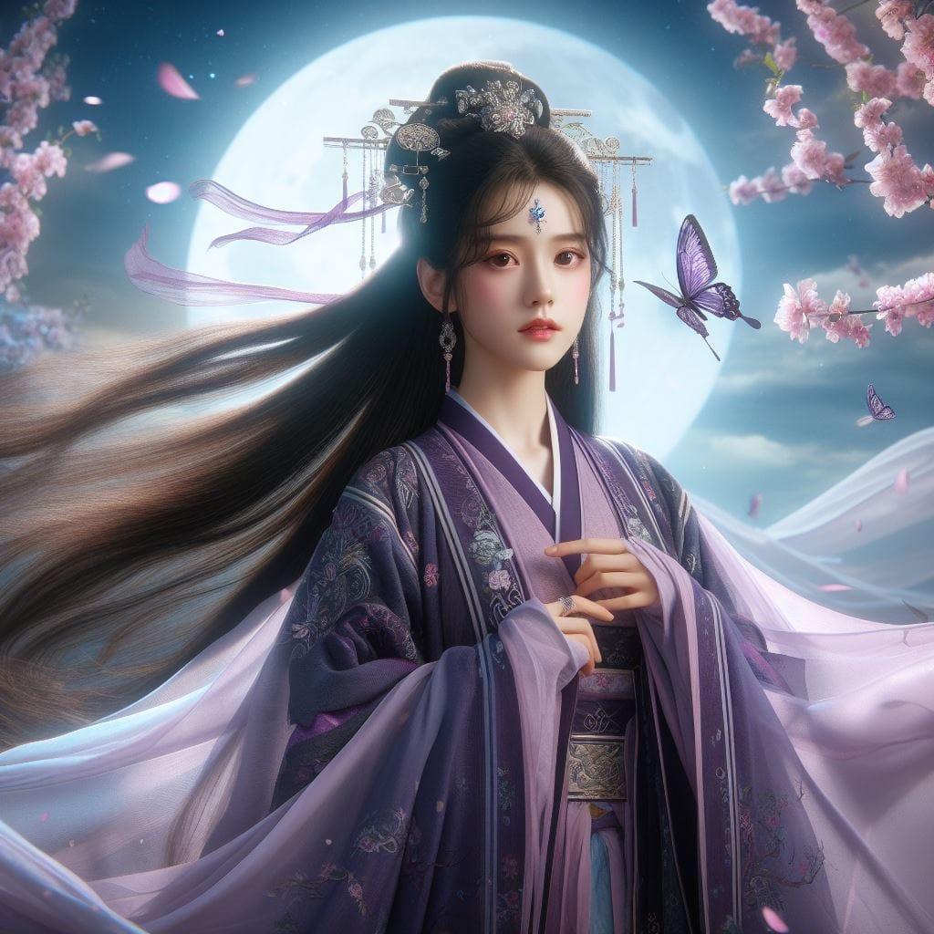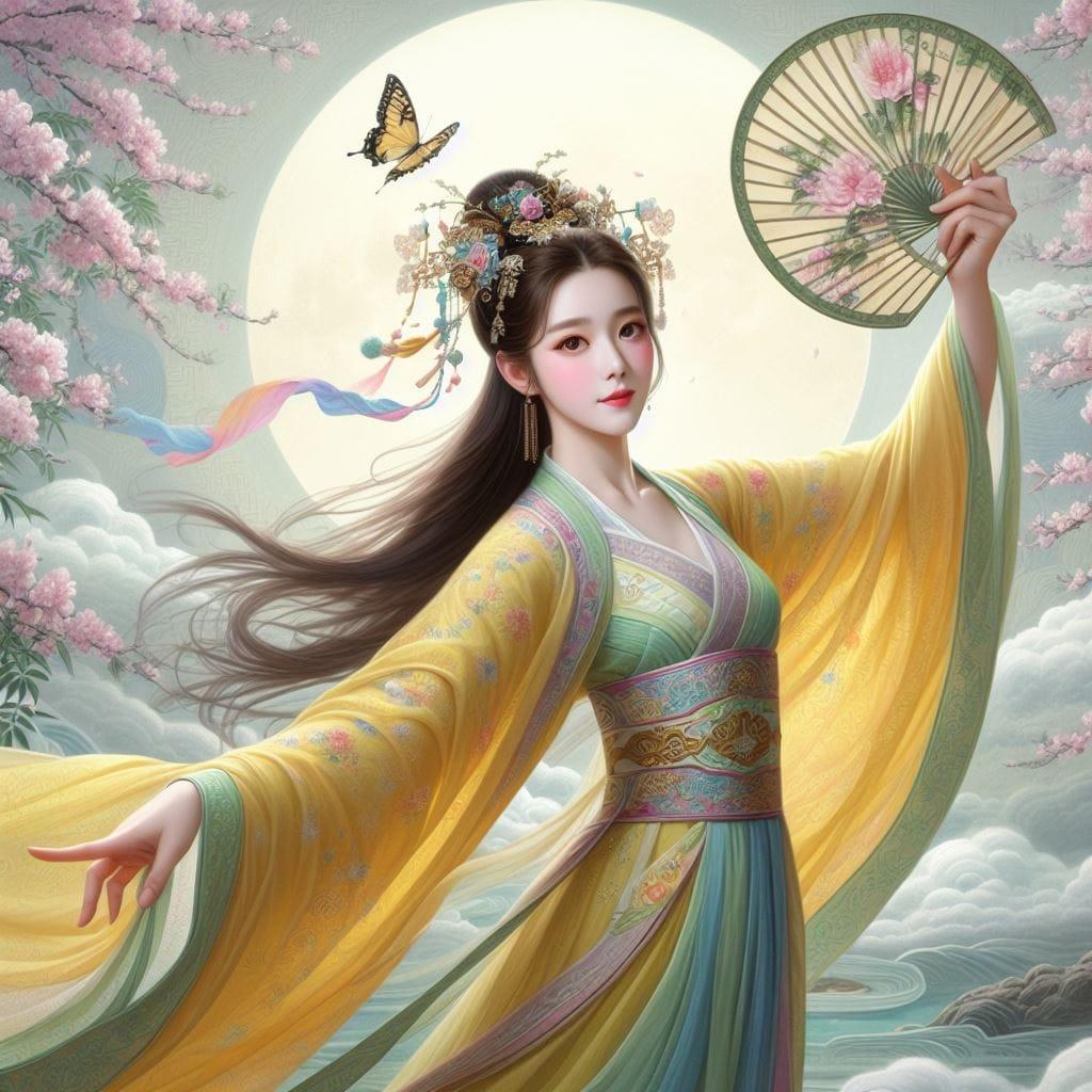 一位美丽的少女穿著传统服饰在月下翩翩起舞