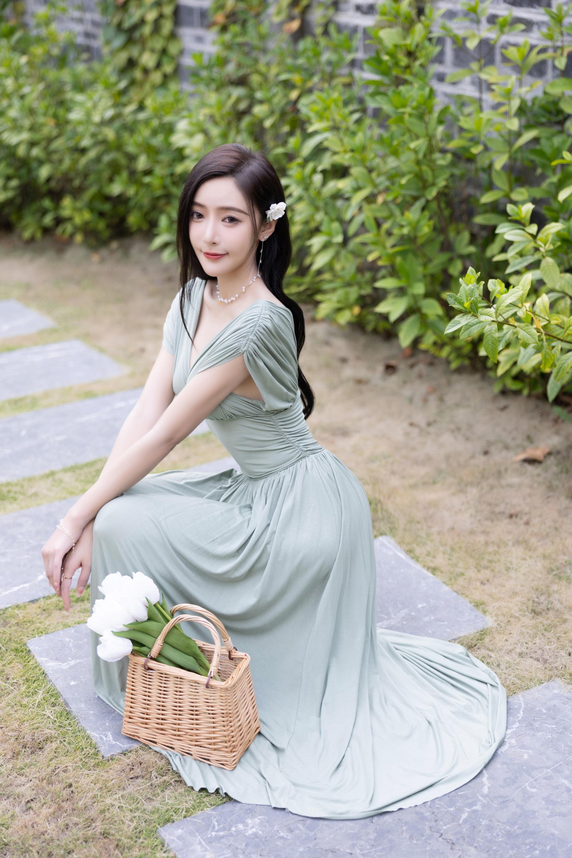 王馨瑶Yanni 豆绿色连衣裙白色泳衣