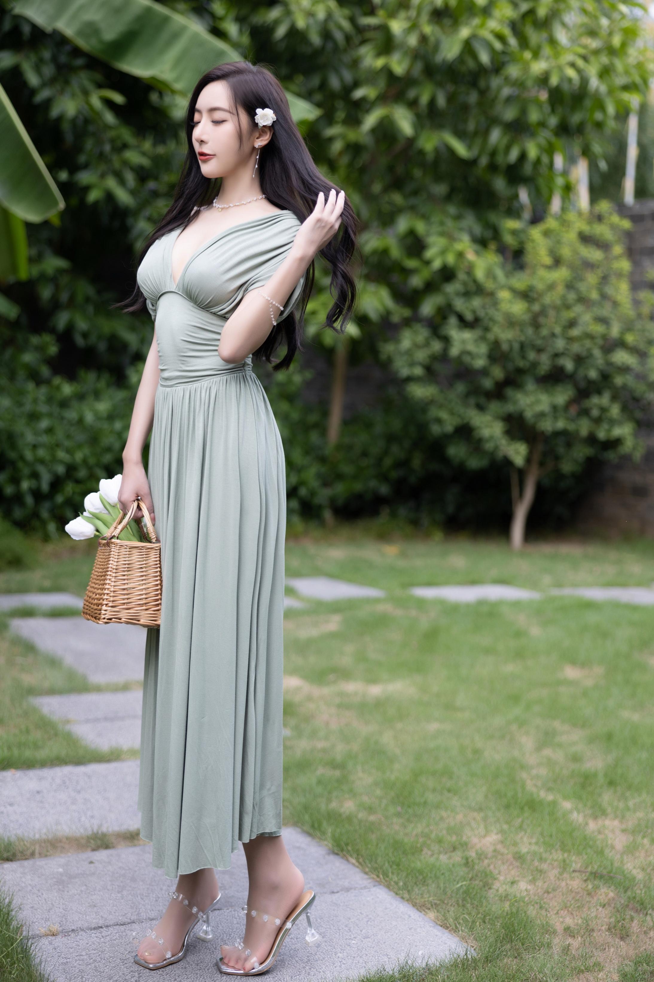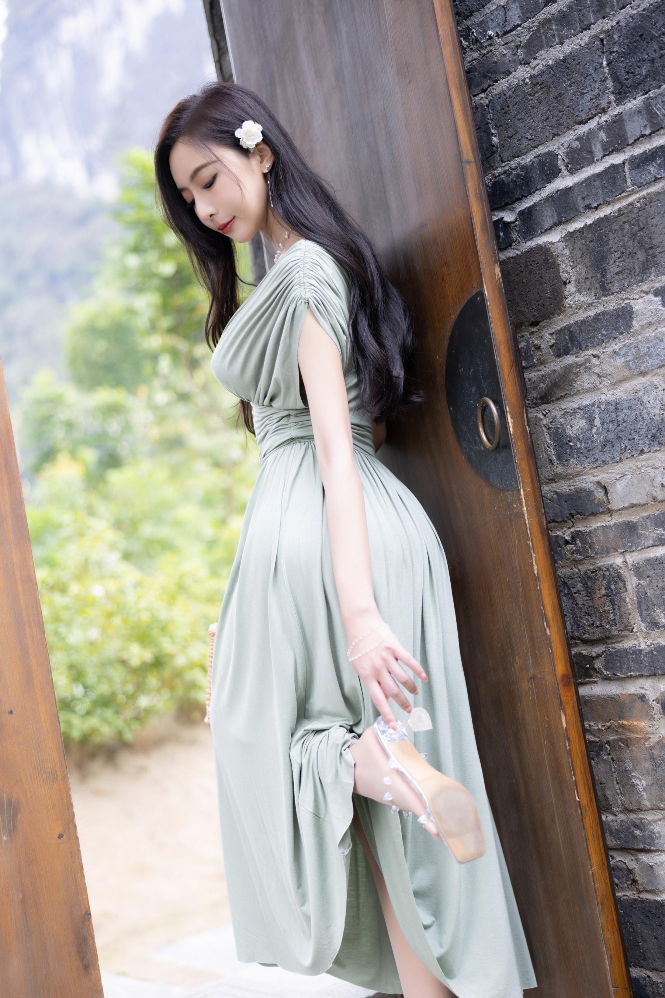 王馨瑶Yanni 豆绿色连衣裙白色泳衣