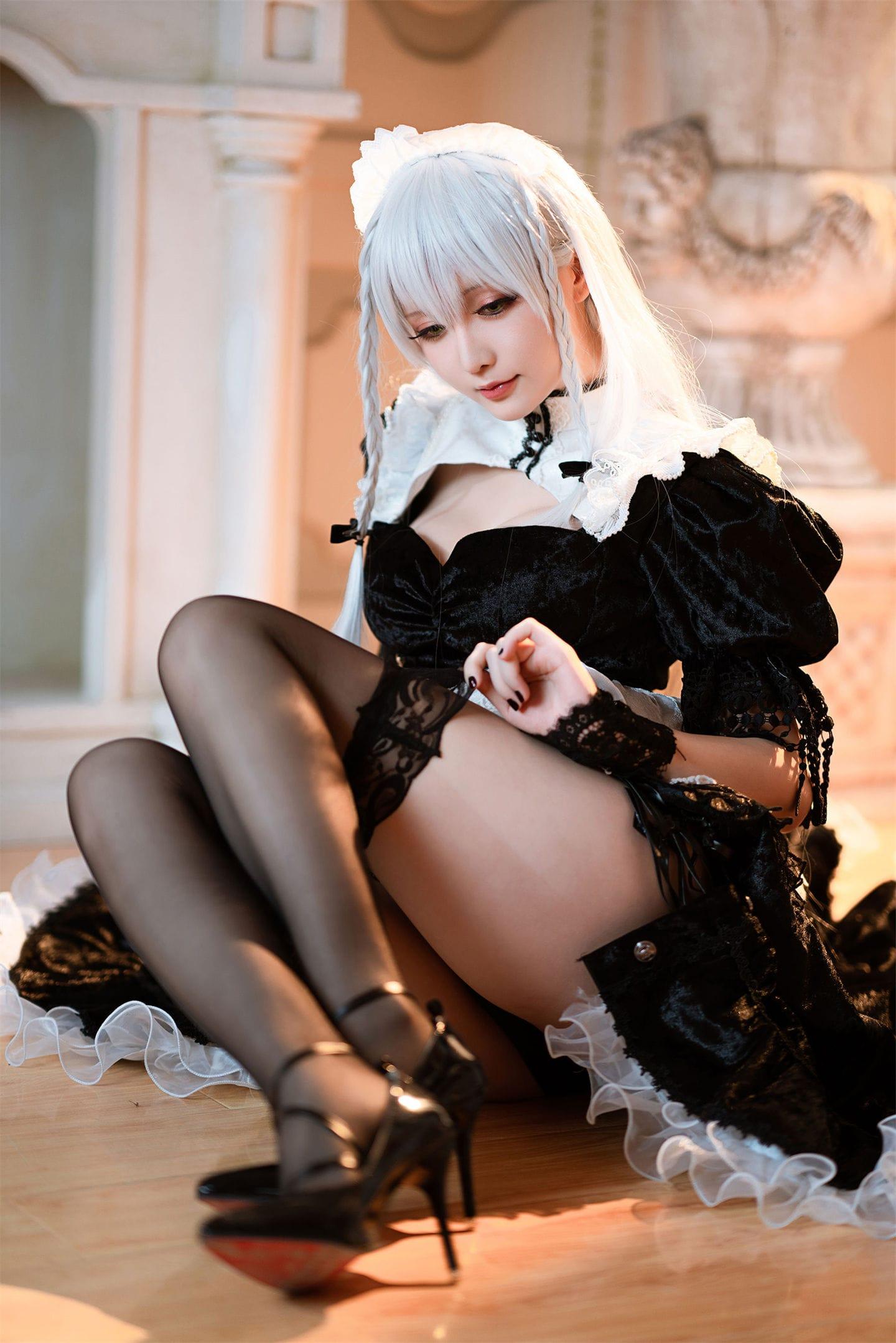 黑丝白发性感女仆cosplay