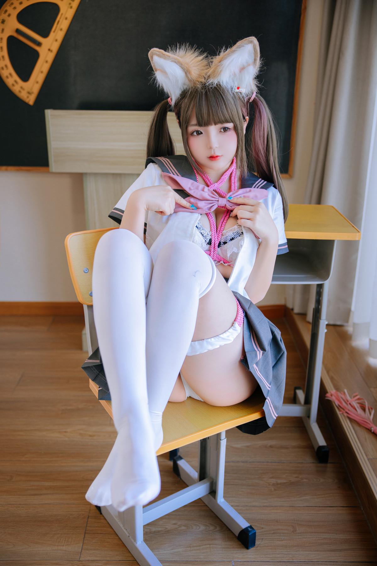 Cosplay美女日奈娇课桌捆绑主题性感白色内衣配白丝袜粉色绳艺捆绑秀惹火身材诱惑写真